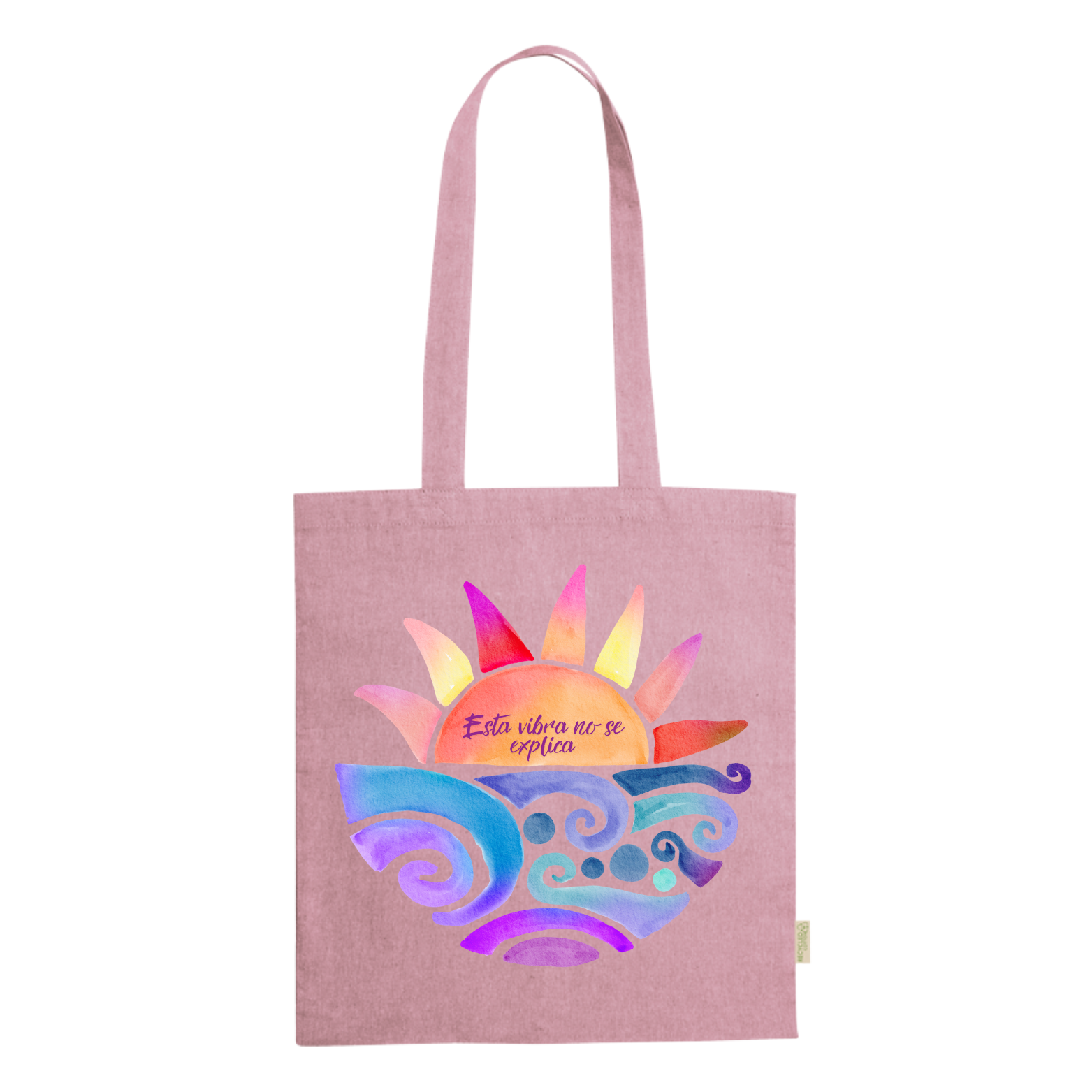 Una bolsa para quienes sienten sin necesidad de explicar. Esta totebag rosa de algodón reciclado (38 x 42 cm) muestra un atardecer cálido y el mensaje “esta vibra no se explica”. Perfecta para espíritus libres, amantes de los momentos que se viven más con el corazón que con palabras. Práctica, con rollazo y comprometida con el planeta.
